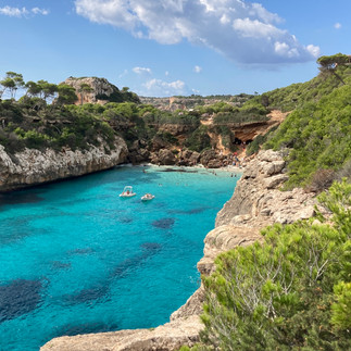 Harmadik nap már nem a hegyek felé vettük az irányt, hanem a sziget dél-keleti részén levő partokat és városokat igyekeztünk felfedezni. Út közben betértünk egy városba, Santanyí-ba ahol megkóstoltunk egy helyi különleges ételt, az ensaïmadat. Ez egy édes fánk szerű sütemény, amit általában reggelire fogyasztanak, létezik lekváros és vanília pudingos változata is. Mi az utóbbit és a sima tésztásat ettük és nekem személy szerint a vaníliás jobban ízlett. A másik, amit igazából minden olyan helyen érdemes kérni, ahol a közelben narancsligetek vannak, az a frissen facsart narancslé. Én mióta Spanyolországban vagyok, sokszor kávé helyett is inkább ezt iszom, mert az otthonival ellentétben ez sokkal édesebb és finomabb (valamint árban is nagyon hasonló a kettő). Bár szerintem lehetséges, hogy valahol facsarnak bele mandarint is.